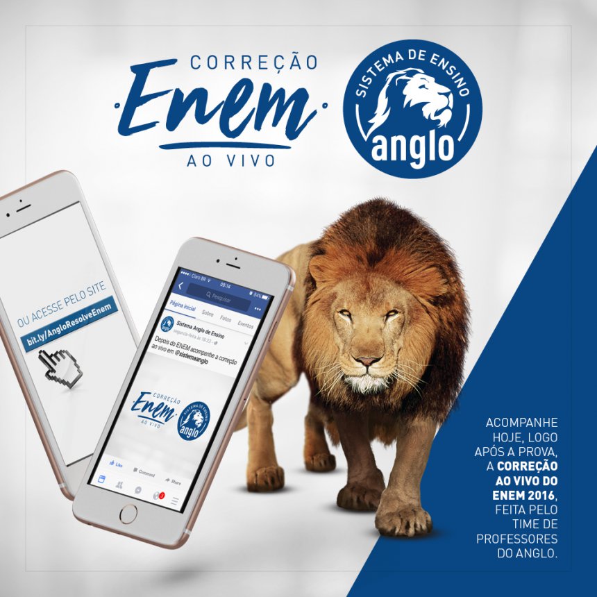 Nos dias 5 e 6 de novembro, após o horário mínimo previsto para o término da prova, os alunos poderão acompanhar uma transmissão ao vivo da correção do ENEM pelos professores do Anglo Vestibulares por meio do site (http://bit.ly/AngloResolveEnem). Essa correção será feita via Facebook Live e começa a partir das 16h, na página do Sistema Anglo.